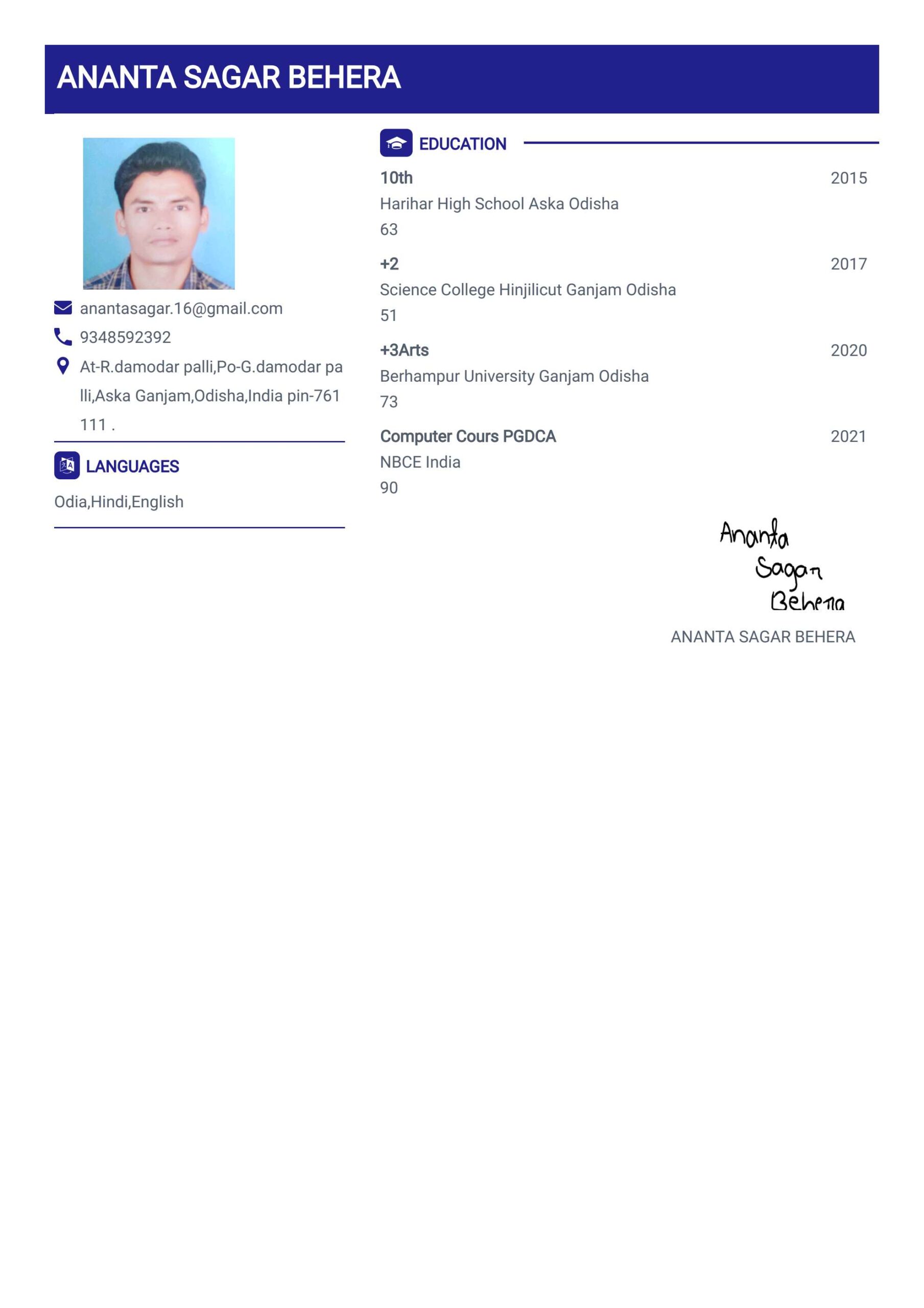 I have Complited Bechuler of Arts from Berhampur University in 2020.i am smart hard worker .